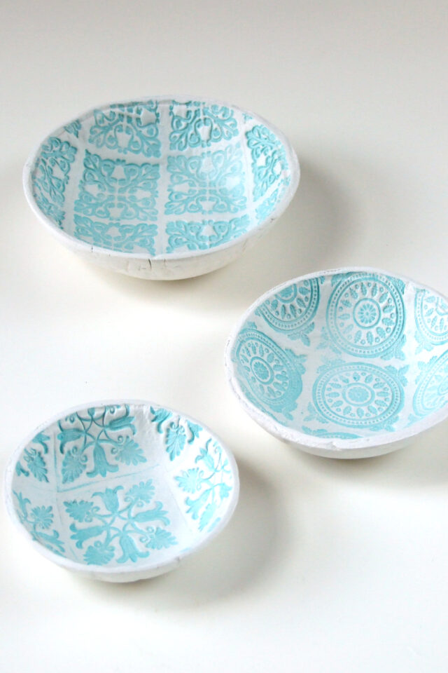 These bowls work well as decorative pieces or small catchalls for trinkets. Because the stamping technique is so versatile, you can experiment endlessly with different designs — no two bowls ever need to look alike.
