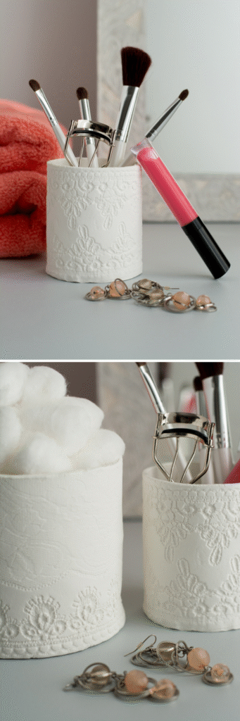 If you have an old lace fabric lying around, you can turn it into a beautiful clay design tool. By pressing lace into air dry clay, you’ll imprint delicate patterns that look almost like embroidery frozen in time. Once hardened, these containers carry an elegant, vintage charm that feels far more intricate than the effort it takes to make them.