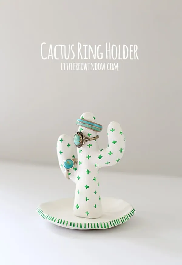 Jewelry storage gets a playful twist with this cactus-inspired ring holder. Sculpted from air dry clay, the “arms” of the cactus act as hooks where you can slide rings for safe keeping. It’s a clever and decorative alternative to traditional jewelry trays.