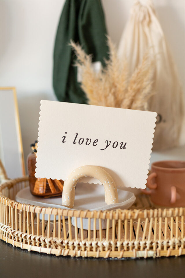 This speckled clay arch is both simple and versatile. By shaping a smooth arch and adding subtle speckles with paint, you create a piece that works as a photo holder, business card stand, or even a place card holder for a dinner table.