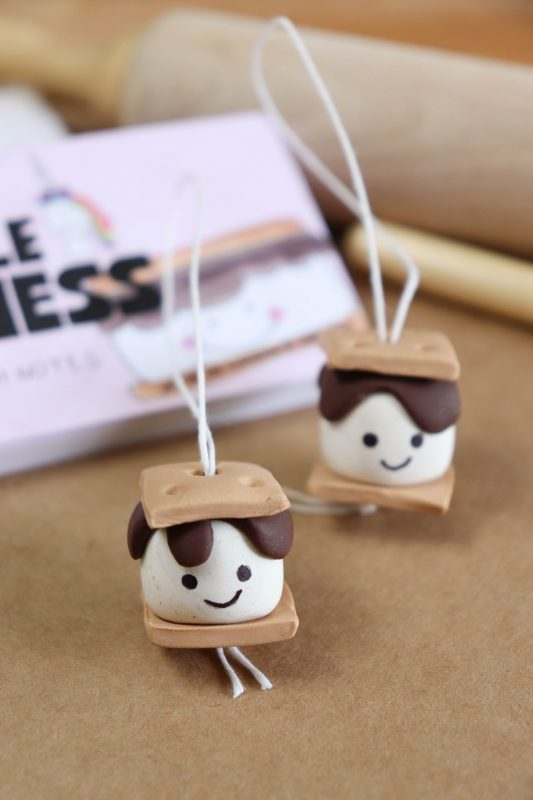 Each piece is carefully constructed with layers representing graham crackers (textured brown clay), chocolate bars (dark brown with scored lines to mimic chocolate squares), and marshmallows (white clay with slightly toasted edges in golden brown).