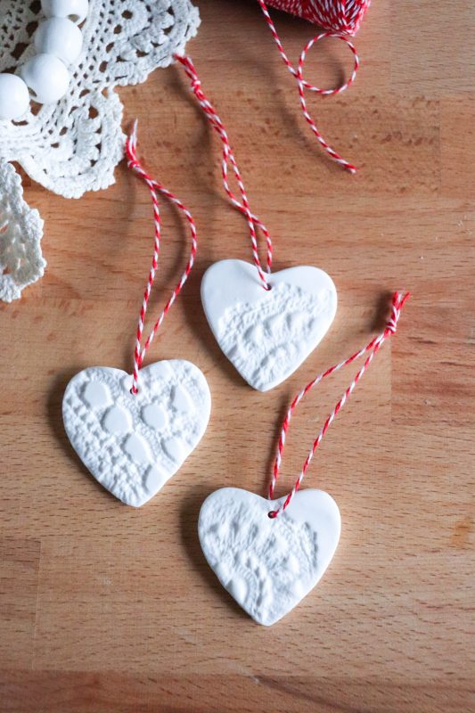 The hearts can be left in natural clay tones or painted with metallic accents to highlight the pressed designs.