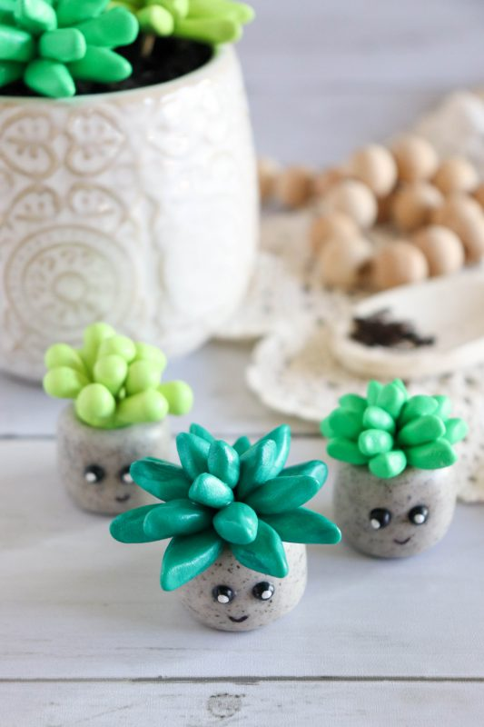 Each succulent is painted in realistic green tones with subtle color variations, and faces are added with fine-tip markers or tiny clay details.