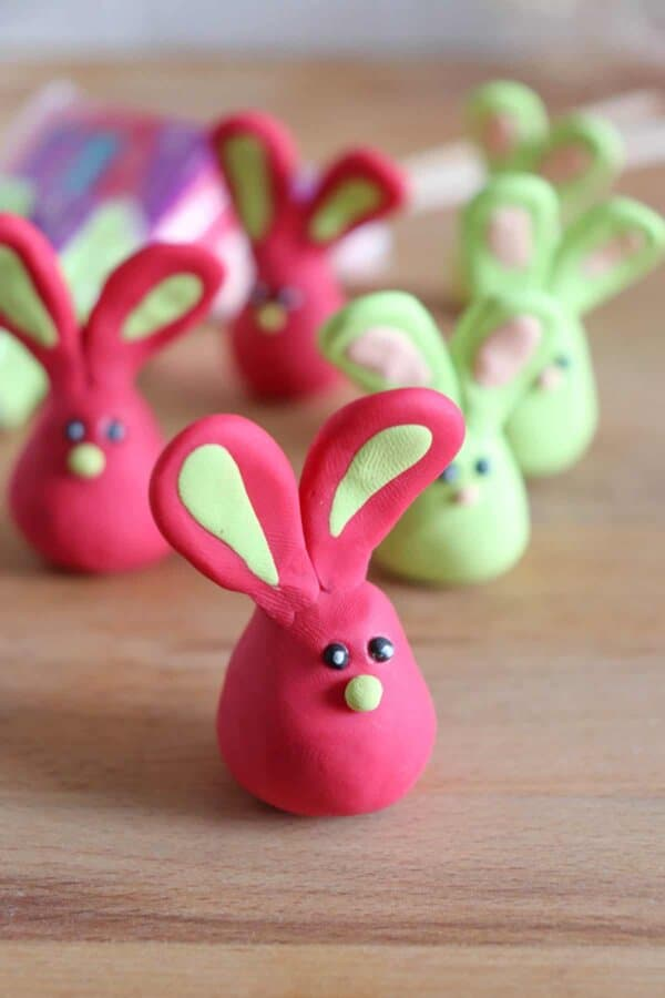 The faces include tiny black bead eyes, pink triangle noses, and subtle mouth details. Some variations include tiny clay carrots, flowers, or Easter eggs as accessories.